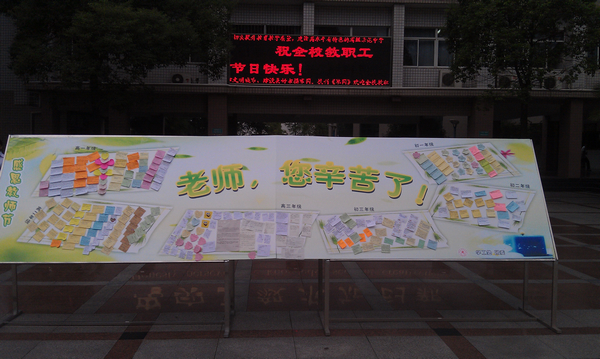進(jìn)入校園后,赫然屹立著一道碩大的“感恩墻”。上面密密麻麻貼滿了一張張祝福小卡片。全校各班都給任教本班的所有老師送上了祝福短語,一張張用心寫滿的卡片,一句句真誠的祝福表達(dá)了對(duì)老師們的濃濃敬意和深情。