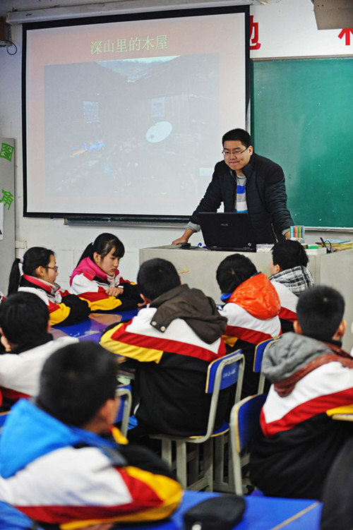 下午15:00,一位精神抖擻,面含笑容的質(zhì)樸青年走進(jìn)了初一(5)班的教室。他就是來(lái)自于恩施州咸豐縣坪壩營(yíng)鎮(zhèn)新場(chǎng)小學(xué)的支教老師——彭軍。在去年的11月20日,5班的學(xué)生通過(guò)《武漢晨報(bào)》結(jié)識(shí)了這位老師和他帶領(lǐng)的班級(jí)里49位學(xué)生,并為那里的孩子送去了書(shū)籍和玩具,幫助他們圓夢(mèng)。新年伊始,彭老師又通過(guò)晨報(bào)記者和初一(5)班取得了聯(lián)系,希望能到這個(gè)充滿了愛(ài)的集體來(lái)看看,也希望能把山區(qū)孩子的祝福和禮物帶給5班的孩子。就這樣,出現(xiàn)了本文開(kāi)頭的場(chǎng)景。