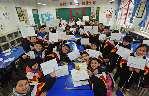 班會(huì)最后,每個(gè)同學(xué)都在一張卡片上面寫下了自己好的新年愿望:“2013年,讓我們一起……”并將這張卡片交給了彭老師,希望他能把自己美好的祝愿帶給山區(qū)的孩子。