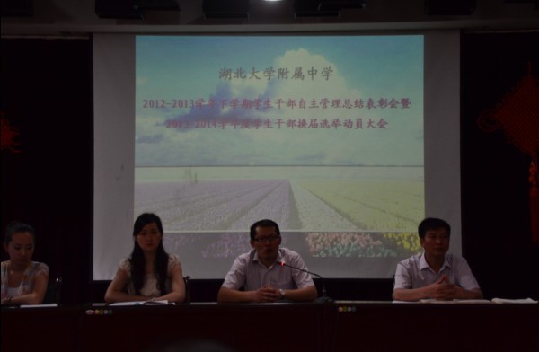 2012-2013學年度學生干部自主管理總結(jié)表彰會暨2013-2014學生干部換屆選舉動員大會于昨天中午1點在二樓報告廳舉行。學工處主任胡勝民、副主任曾國斌、校團委書記張莉出席,全體校級學生干部和年級學生干部參加會議。大會由校團委魯芳蕾老師主持。