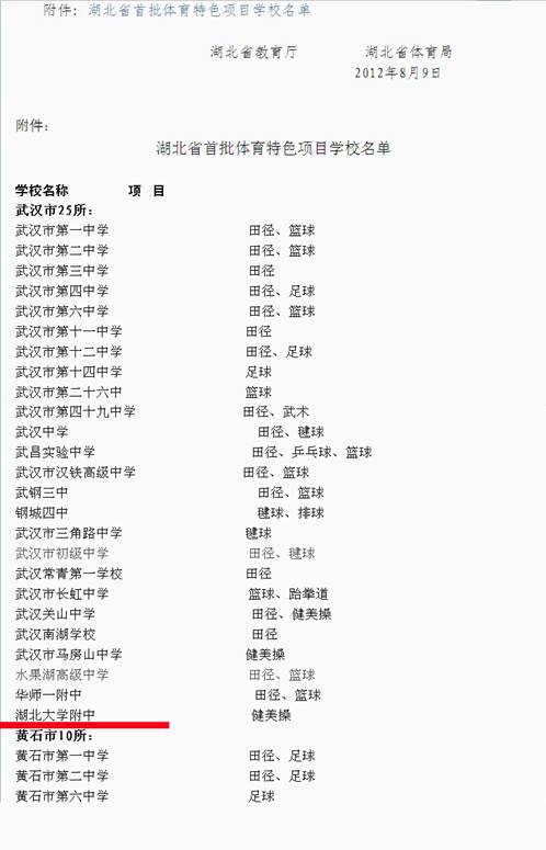 四、在省教育廳、省體育局聯(lián)合舉辦的省首批體育特色項目學(xué)校評選活動中,學(xué)校榮獲湖北省首批體育特色項目學(xué)校 。