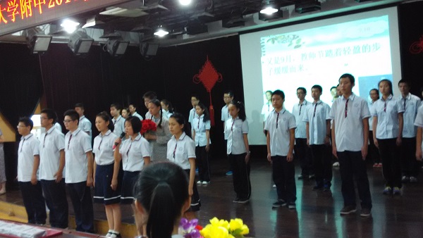 4.教師節(jié)表彰會出演舞臺劇《桂花魂》。來自新一屆校團委學生會候選人、舞蹈社、各年級學生代表共五十余名同學參與了該劇,經過為期兩周的訓練、彩排,在魯芳蕾、張莉老師的指導下,成功上演了一場感人肺腑的舞臺劇。演出現場,老師們屏住呼吸、靜靜地觀看者學生們深情的表演,最后,在一曲《愛的箴言》的歌曲中,同學們通過詩歌朗誦的方式向老師們送出了真摯的祝福和感謝的話語,老師們報以熱烈的掌聲感謝同學們的祝福,會場氣氛熱烈,校領導對該節(jié)目做了高度的肯定和表揚。