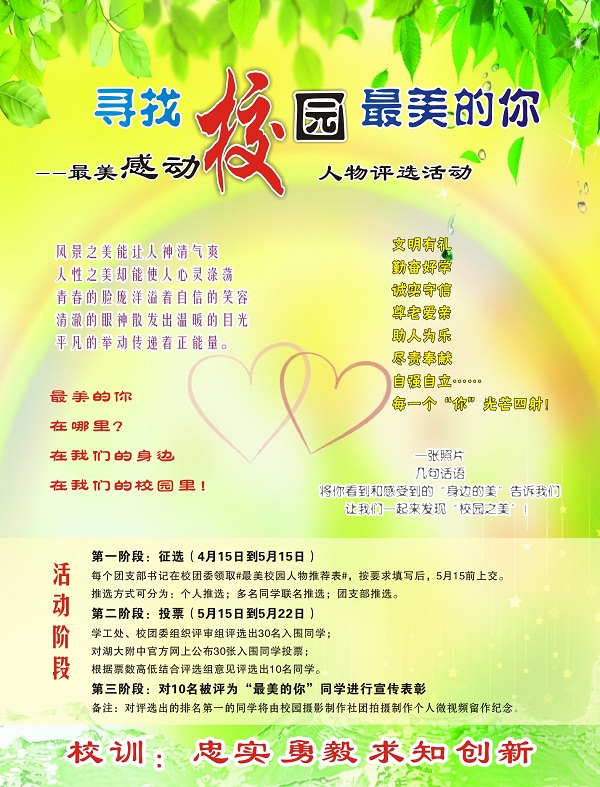 每個團支部書記在校團委領取#最美校園人物推薦表#,按要求填寫后,5月15前上交。