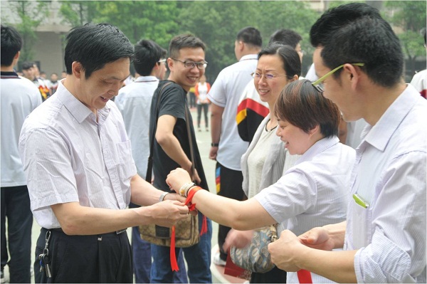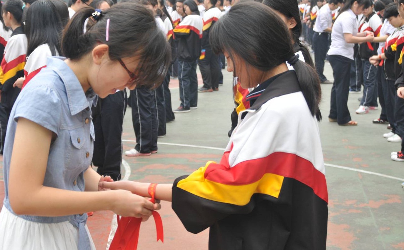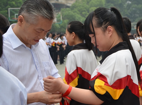 他們的演講獲得陣陣掌聲,操場(chǎng)上的高二學(xué)子們則用響徹云霄的聲音一次次傳遞著“加油!加油!加油……”的呼喊,現(xiàn)場(chǎng)氣氛迅速高漲起來。緊接著,副校長(zhǎng)朱寧代表學(xué)校為高三送來祝福和溫馨的話語,而伴隨著《年輕的戰(zhàn)場(chǎng)》的音樂響起,校黨總支書記何鳳桃和校領(lǐng)導(dǎo)、高三全體教師們?yōu)榧磳⒉饺肟紙?chǎng)的學(xué)子們系上“加油!美麗青春,相信自己”的紅絲帶,這一根根紅絲帶傳遞著愛的祝福、新的希望和難以割舍的師生情誼,許多同學(xué)在現(xiàn)場(chǎng)落下感動(dòng)的淚水,其他年級(jí)的同學(xué)們也被這種真實(shí)而感人肺腑的場(chǎng)面所打動(dòng)。在一曲勵(lì)志歌曲《我相信》的歌聲中,高三學(xué)子依次穿過由“小紅帽”和“綠軍裝”相對(duì)的筆直的通道,全校師生目送他們離開這最后一次升旗儀式的會(huì)場(chǎng)。