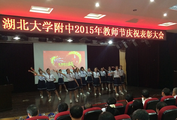 在學(xué)校舉行的2015年教師節(jié)慶祝表彰大會(huì)上,校團(tuán)委播放了精心制作的祝福視頻。來(lái)自全國(guó)各地2006屆到2015屆的畢業(yè)生們表達(dá)了對(duì)恩師誠(chéng)摯的祝福,“祝您節(jié)日快樂(lè),您辛苦了!”一句句感恩的祝福和問(wèn)候,在二樓報(bào)告廳內(nèi)久久回蕩。隨后在《唱給老師的歌》悠揚(yáng)的歌聲中,初二(1)班全體同學(xué)帶來(lái)的精彩舞蹈和深情朗誦都向可親可敬的老師們表達(dá)了無(wú)盡誠(chéng)摯的感激之情。