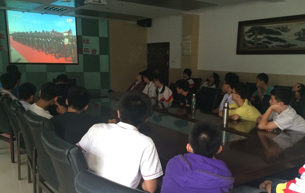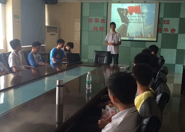 會(huì)上,大家一起觀看了紀(jì)錄片《比太陽(yáng)早起的士兵》了解了天安門國(guó)旗護(hù)衛(wèi)隊(duì)士兵的訓(xùn)練生活,視頻《紀(jì)念抗戰(zhàn)70周年的升旗儀式》讓同學(xué)們被國(guó)旗護(hù)衛(wèi)隊(duì)的颯爽英姿所震撼,短片《湖大附中國(guó)旗班》也讓大家倍增自豪之感。