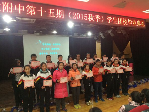 2015年12月2日,我校第十五期(2015秋季)學(xué)生團(tuán)校畢業(yè)典禮在二樓報(bào)告廳順利舉行。學(xué)工處主任胡勝民、校團(tuán)委書記張莉出席了典禮,本次活動由校團(tuán)委副書記王思憶主持。