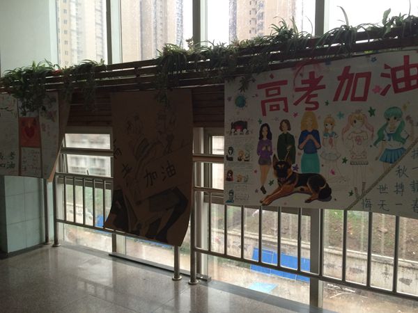 5月27日,距離高考還有11天,校園的走廊里掛起了一張張給高三學(xué)子們加油的手繪海報(bào)。這是由校團(tuán)委組織的“為高三加油 為學(xué)長祝!睘橹黝}的手繪海報(bào)比賽的作品,總共28副海報(bào),由初一、初二、高一、高二的23個班級繪制而成。