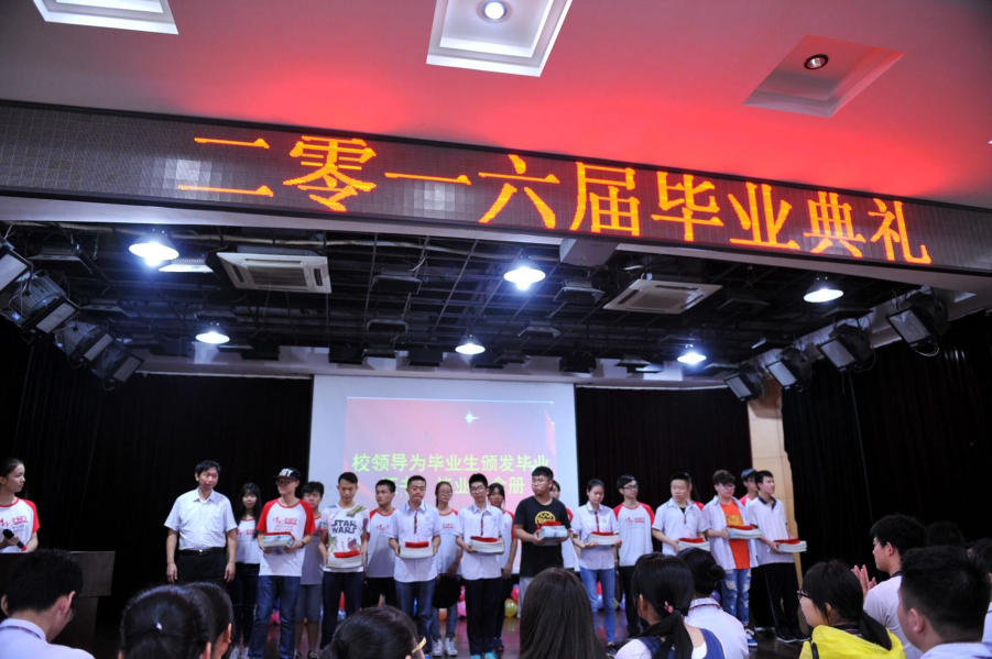 校長(zhǎng)黃朝炎、副校長(zhǎng)劉朝新、教務(wù)處主任黃炳香、學(xué)工處主任胡勝民以及2016屆高中畢業(yè)班全體師生出席典禮。隨著主持人宣布畢業(yè)典禮開始,在場(chǎng)的每個(gè)人在《義勇軍進(jìn)行曲》的激揚(yáng)節(jié)奏下高唱國(guó)歌,宣布自己從一個(gè)終點(diǎn)即將走向另一個(gè)起點(diǎn)。校長(zhǎng)黃朝炎長(zhǎng)以“放飛夢(mèng)想”為主題,向2016屆高三學(xué)子寄語,諄諄告誡他們做有理想有擔(dān)當(dāng)之人,真誠(chéng)祝福他們今后的學(xué)習(xí)工作一帆風(fēng)順。黃校長(zhǎng)的講話令同學(xué)們感動(dòng)不已,熱烈的掌聲久久不息。接著高三學(xué)生代表發(fā)言,高三各班學(xué)生代表為高三年級(jí)的老師獻(xiàn)花。最后在《放飛夢(mèng)想》的背景音樂聲中,學(xué)校領(lǐng)導(dǎo)及高三年級(jí)主任衛(wèi)月琴為畢業(yè)生頒發(fā)畢業(yè)證、畢業(yè)紀(jì)念冊(cè)。