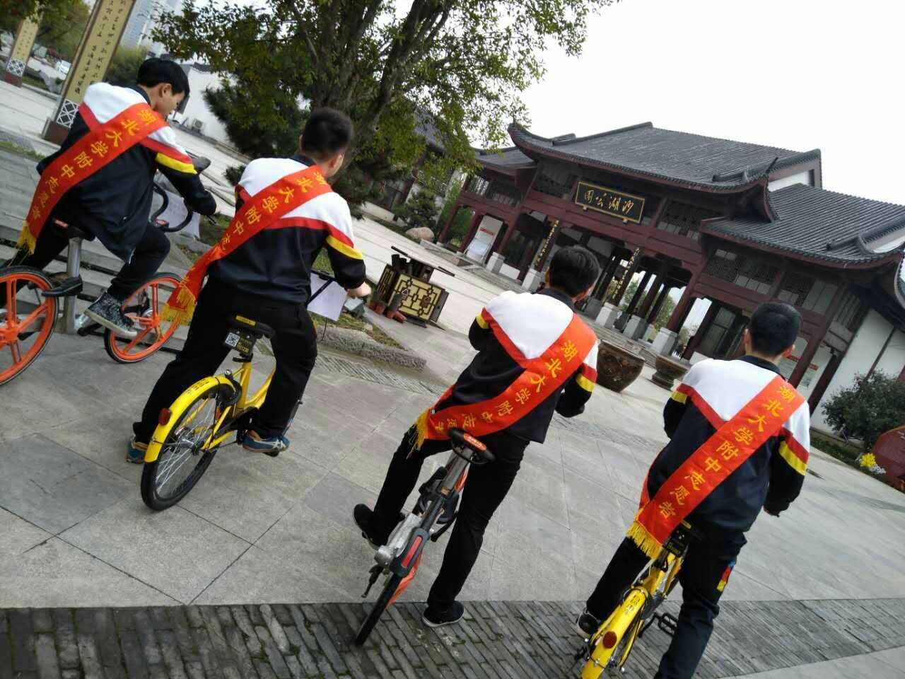 2017年3月18日湖北大學附屬中學高二(五)班團支部的四名同學,自發(fā)利用周末時間,為共享單車貼上“愛護共享單車,共建社會文明”的標語,在沙湖公園附近的人流密集區(qū)宣傳,傳播正能量。