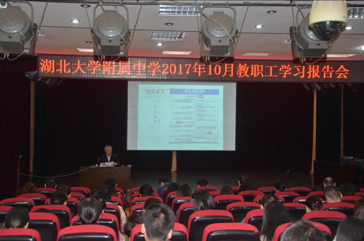 2017年10月16日下午4點(diǎn)30分,湖北大學(xué)附中中層以上干部以及教研組長(zhǎng)、備課組長(zhǎng)在二樓報(bào)告廳聆聽了朱寧副校長(zhǎng) “迎接新高考”的專題報(bào)告會(huì)。