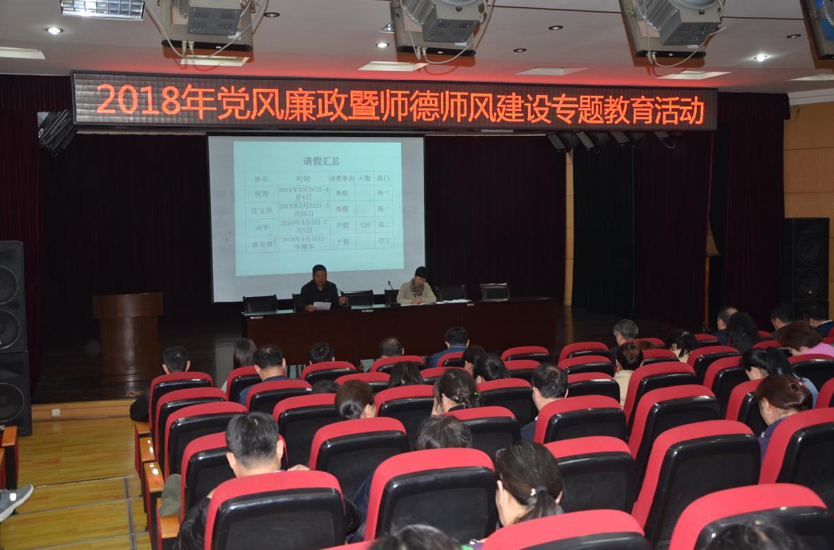 2018年4月23日下午,全校教職工在二樓報(bào)告廳參加了2018年黨風(fēng)廉政暨師德師風(fēng)建設(shè)專(zhuān)題教育活動(dòng)。