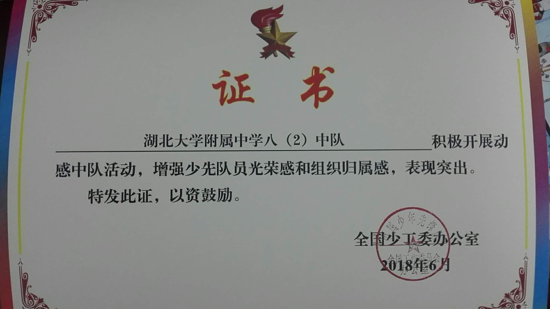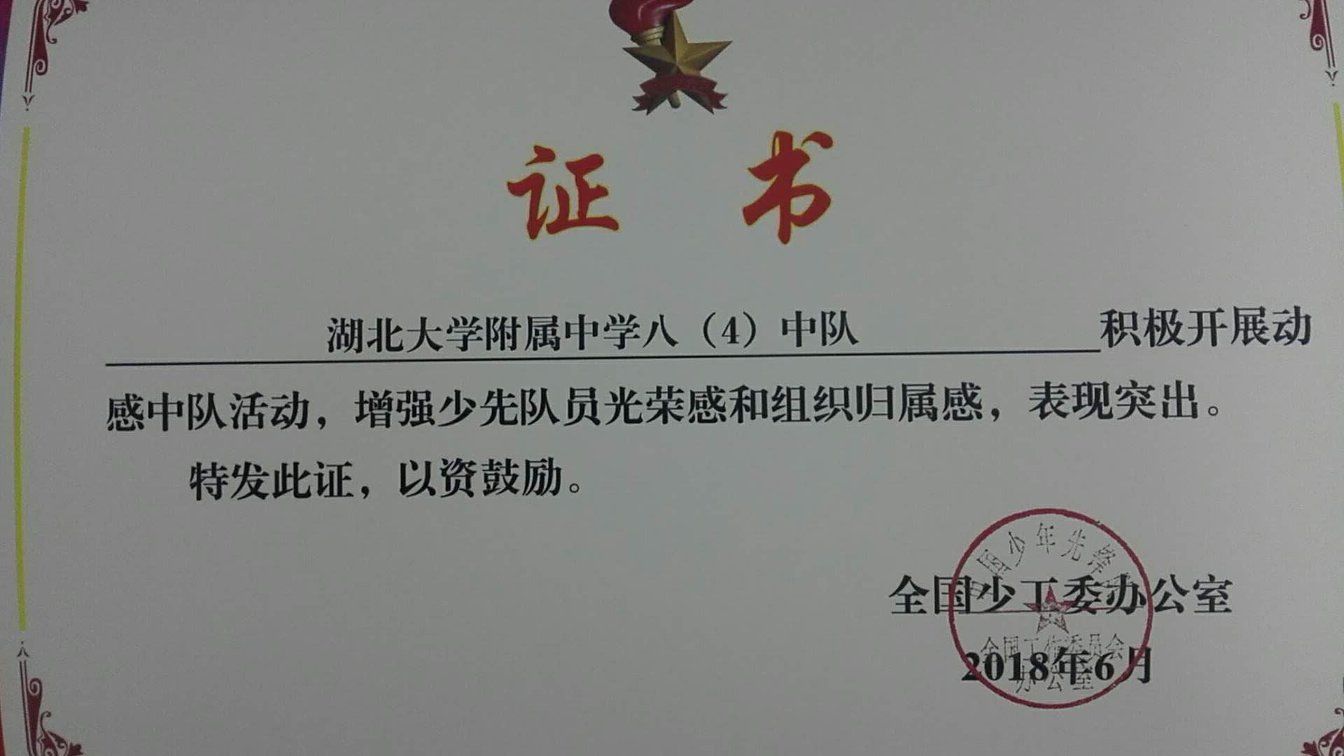 自2017年4月以來,我校大隊根據(jù)《少先隊改革方案》部署,按照全國少工委和湖北省少工委《關(guān)于大力發(fā)動全國中小學少先隊組織積極開展“動感中隊”創(chuàng)建活動的通知》安排和工作要求,我校積極組織開展“動感中隊”創(chuàng)建活動,號召各以中隊為單位開展“紅領(lǐng)巾小健將” “紅領(lǐng)巾小百靈”“紅領(lǐng)巾小書蟲” “紅領(lǐng)巾小創(chuàng)客” “紅領(lǐng)巾小主人”活動。 經(jīng)過自主申報,省少工委推薦,我校七(1)(輔導員:張紅)、八(2)(輔導員:金莎)、八(4)(輔導員:伍漢)三個中隊被評選為全國優(yōu)秀“動感中隊”。