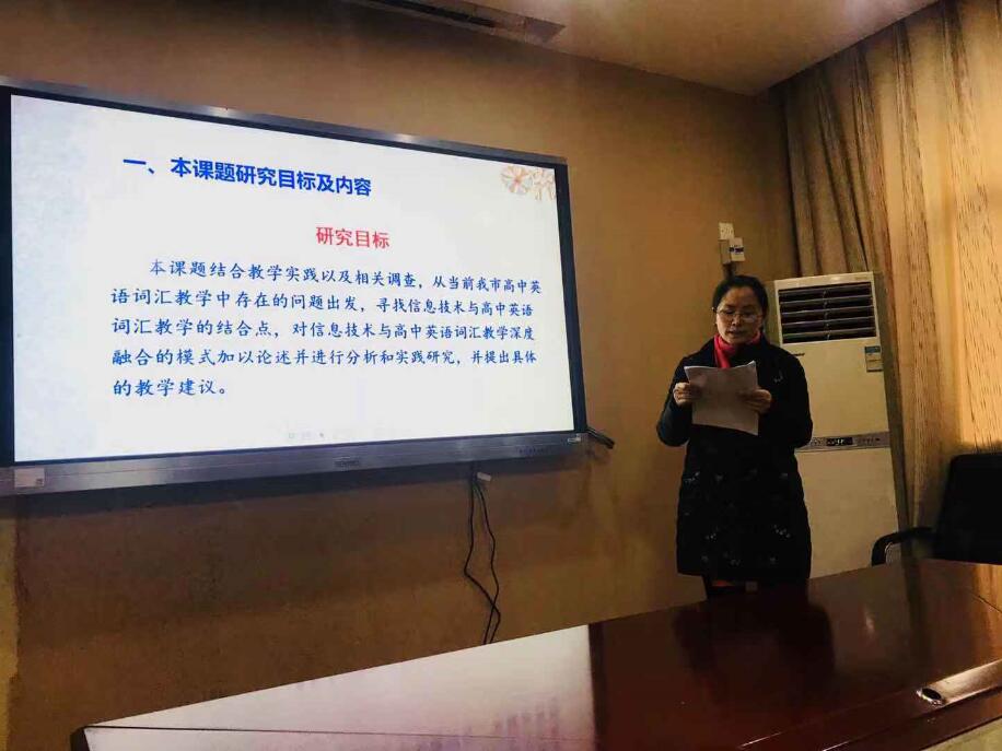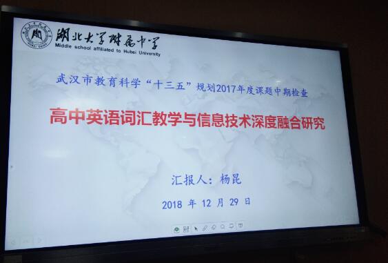 2018年12月29日,受武漢市教育科學(xué)規(guī)劃領(lǐng)導(dǎo)小組辦公室委托,武昌區(qū)教育科學(xué)規(guī)劃領(lǐng)導(dǎo)小組辦公室組織專(zhuān)家,對(duì)湖北大學(xué)附屬中學(xué)楊昆老師承擔(dān)的武漢市教育科學(xué)“十三五”規(guī)劃課題《高中英語(yǔ)詞匯教學(xué)與信息技術(shù)深度融合研究》進(jìn)行了中期檢查。