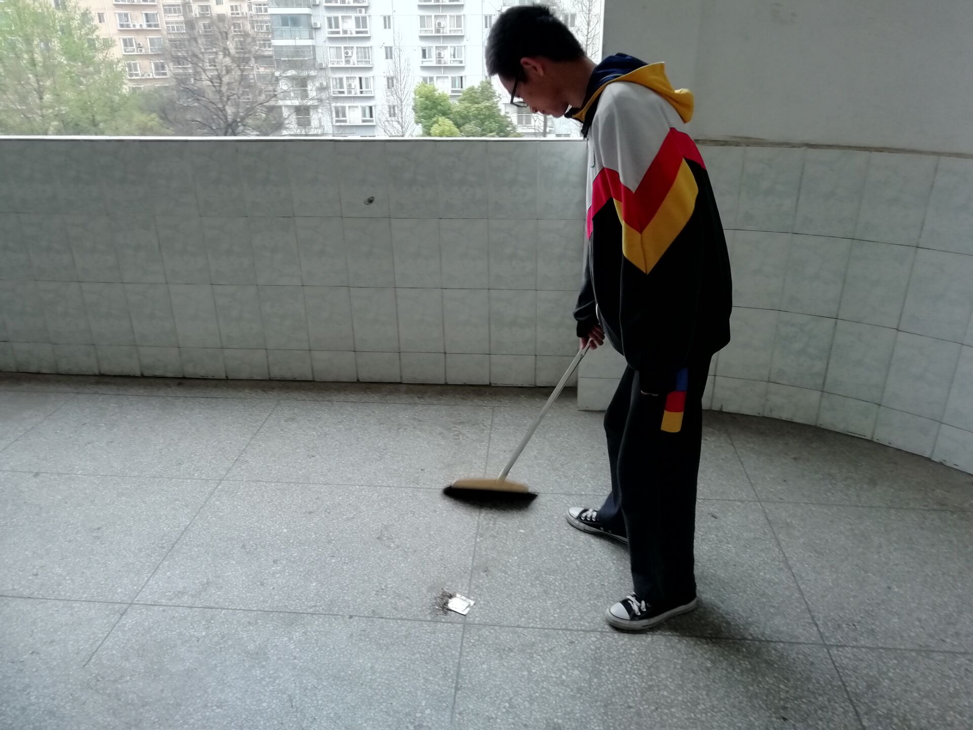 周五下午綜合課,全體同學(xué)拿起了清掃工具分成五個小組跟隨小組長分配到科技樓五個樓層進行清潔。在活動中,同學(xué)們掃地,擦瓷磚、門,清理落滿樹葉的窗槽。同學(xué)們在勞動過程中相互配合,分工明確,十分默契。雖然“汗水與塵土齊飛”,但是同學(xué)們臉上都洋溢著快樂的笑容,深刻體會著志愿者精神的豐富內(nèi)涵。經(jīng)過同學(xué)們的熱情勞作,原本落滿灰塵的科技樓變得煥然一新。