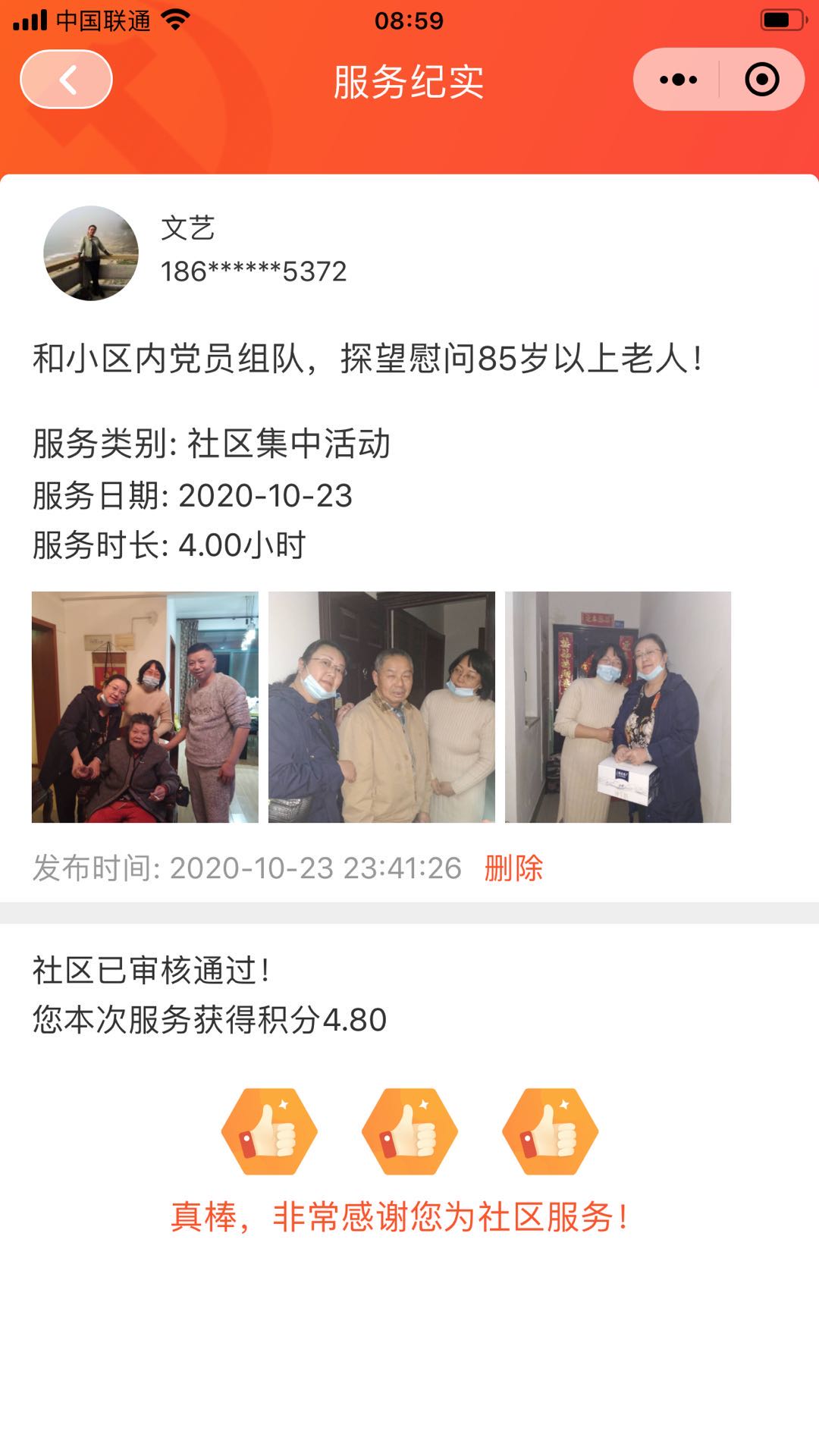 2020年10月23日,文藝同志和社區(qū)內(nèi)黨員組隊(duì),探望慰問85歲以上老人。