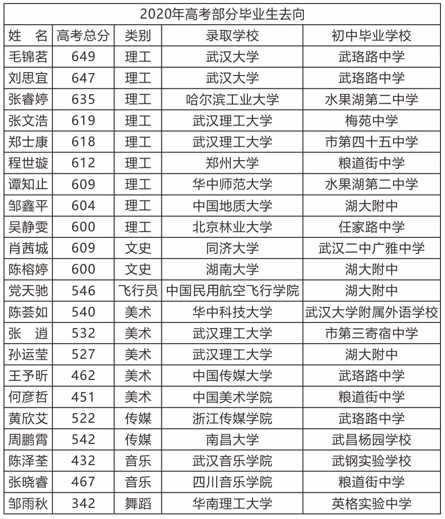 學(xué)校連續(xù)19年獲得武昌區(qū)高考質(zhì)量一等獎。2020年、2019年、2018年連續(xù)三年高考一本率超30%、本科率近82%,穩(wěn)居同類學(xué)校前列。2018年600分以上12人, 2019年600分以上8人,2020年600分以上11人。