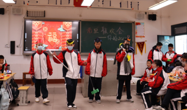 在近兩個小時的聯(lián)歡活動中,歌聲不斷,笑聲不絕。各班聯(lián)歡會形式多樣,有的從課本閱讀材料中選擇題材進行再創(chuàng)作,改編成小劇本;有的根據(jù)校園生活,自編自創(chuàng)小品;有的在老師的幫助下利用學科知識編排錄制“魔術表演”為大家播放,不僅新奇有趣還科普了學科小知識;還有各種舞蹈、歌曲表演、聯(lián)歡游戲,精彩紛呈,令人目不暇接。