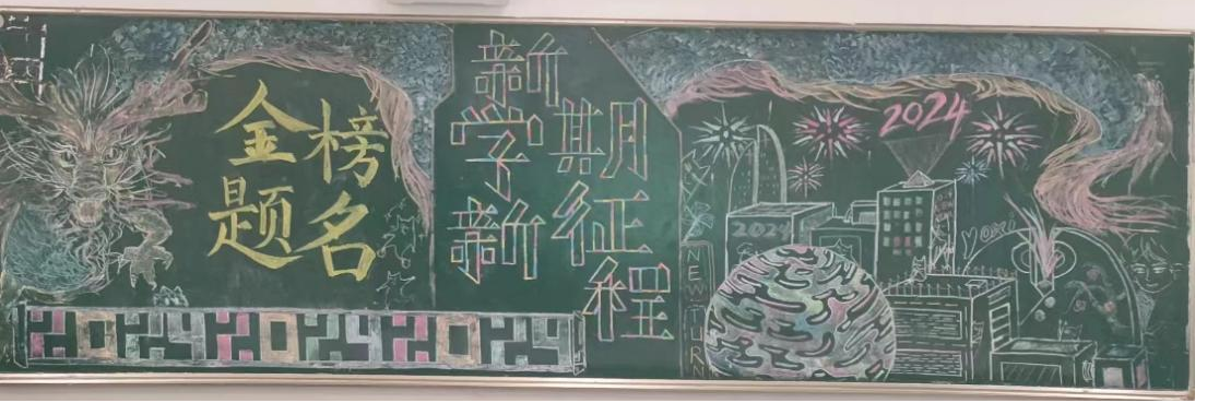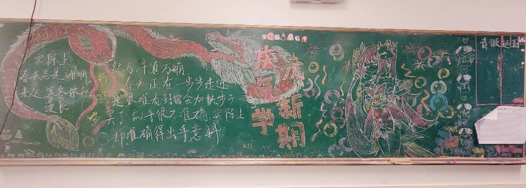 高一(5)班的黑板報上盤旋著一條通紅的“火龍”,同學們新學期元氣滿滿!