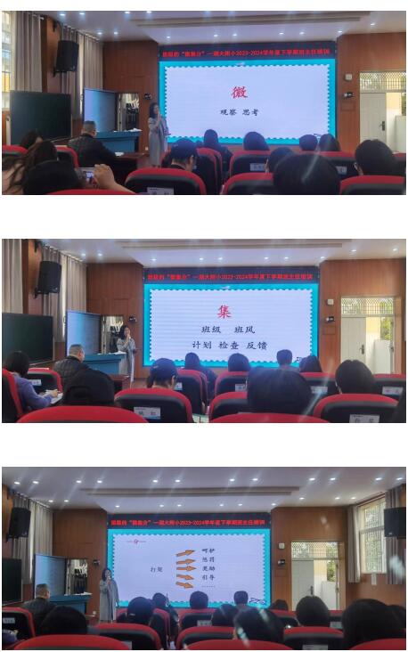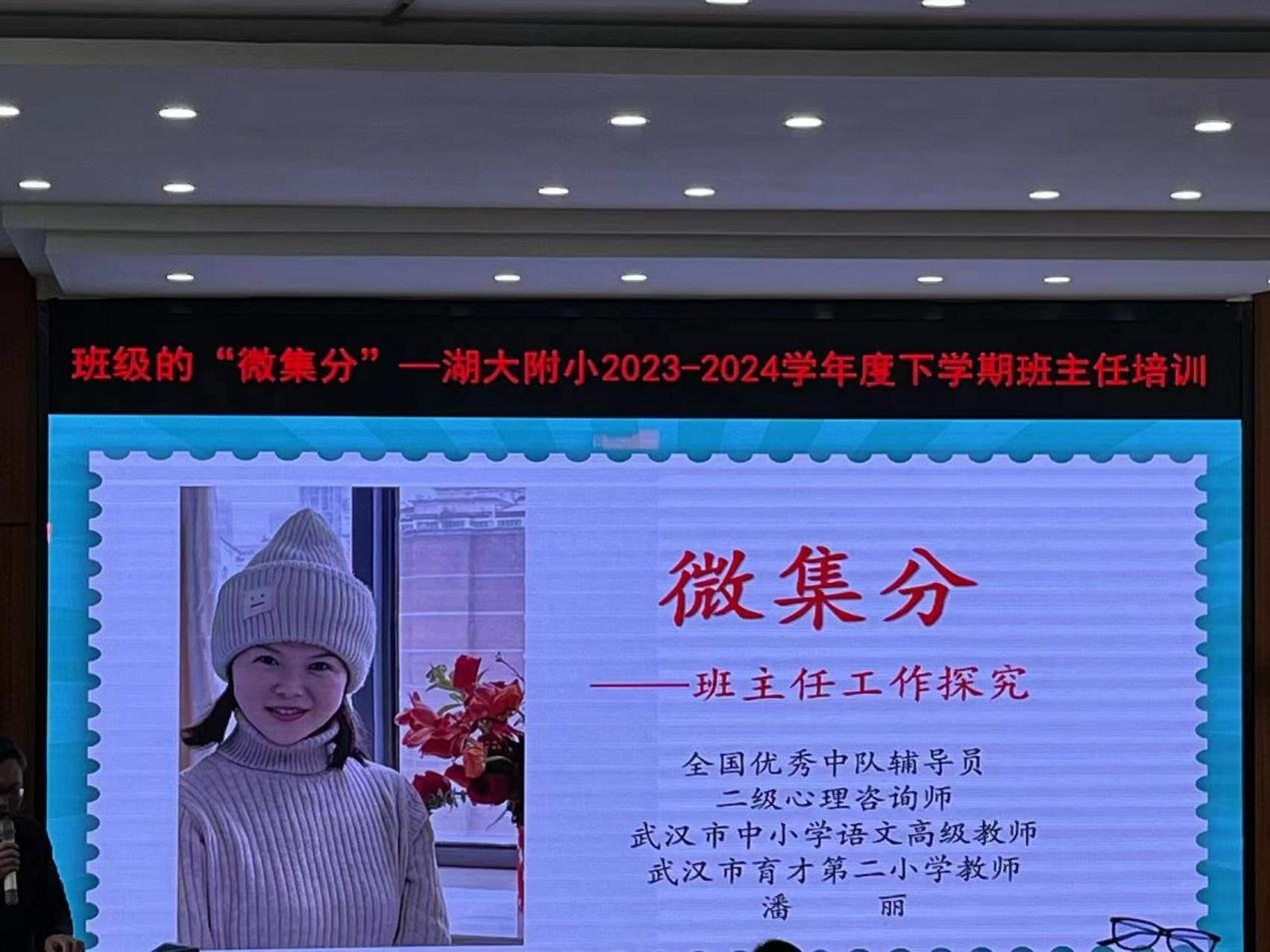 2024年3月15日14:40,我校骨干教師及班主任在學(xué)工處陳志輝主任的帶領(lǐng)下,加了在湖大附小舉行的“2023-2024學(xué)年度下學(xué)期班主任培訓(xùn)會”。本次培訓(xùn)邀請了全國優(yōu)秀中隊輔導(dǎo)員、武漢市優(yōu)秀班主任、武漢市育才第二小學(xué)的潘麗老師進行講座。潘麗老師做了《微集分-班主任工作探究》的工作報告,主要從“微”:觀察、思考;“集”:班級、班風;“分”:呵護、懲罰、獎勵、引導(dǎo)等三個方面進行了詳細生動的講解。