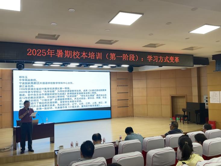 2025年7月10日下午,我校暑期校本培訓(xùn)第一階段進(jìn)行最后一場(chǎng),我們邀請(qǐng)到了寧波高新區(qū)外國(guó)語(yǔ)學(xué)校數(shù)學(xué)學(xué)科中心主任鄭華玉老師,作了“學(xué)習(xí)方式變革”的主題報(bào)告。鄭華玉老師把潛心教改十六載的實(shí)踐,濃縮在“超越與重構(gòu):‘小組主講’的課堂實(shí)踐”的報(bào)告中。他用豐富的案例、具體的方法詮釋了“學(xué)為中心”的課堂內(nèi)涵,對(duì)一線教師如何真正引導(dǎo)學(xué)生深度學(xué)習(xí)、提升學(xué)科素養(yǎng)進(jìn)行了有效培訓(xùn)和指導(dǎo)。