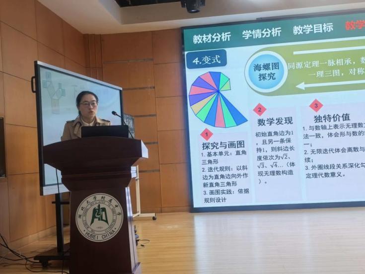 湖北大學(xué)附屬中學(xué)楊彩云老師以《利用勾股定理繪制圖案》為題說課,立足項(xiàng)目式學(xué)習(xí)理念,以“勾股畫廊”創(chuàng)作展為驅(qū)動,引導(dǎo)學(xué)生繪制經(jīng)典數(shù)學(xué)圖案,運(yùn)用幾何畫板與AI輔助設(shè)計,凸顯技術(shù)賦能與素養(yǎng)導(dǎo)向。