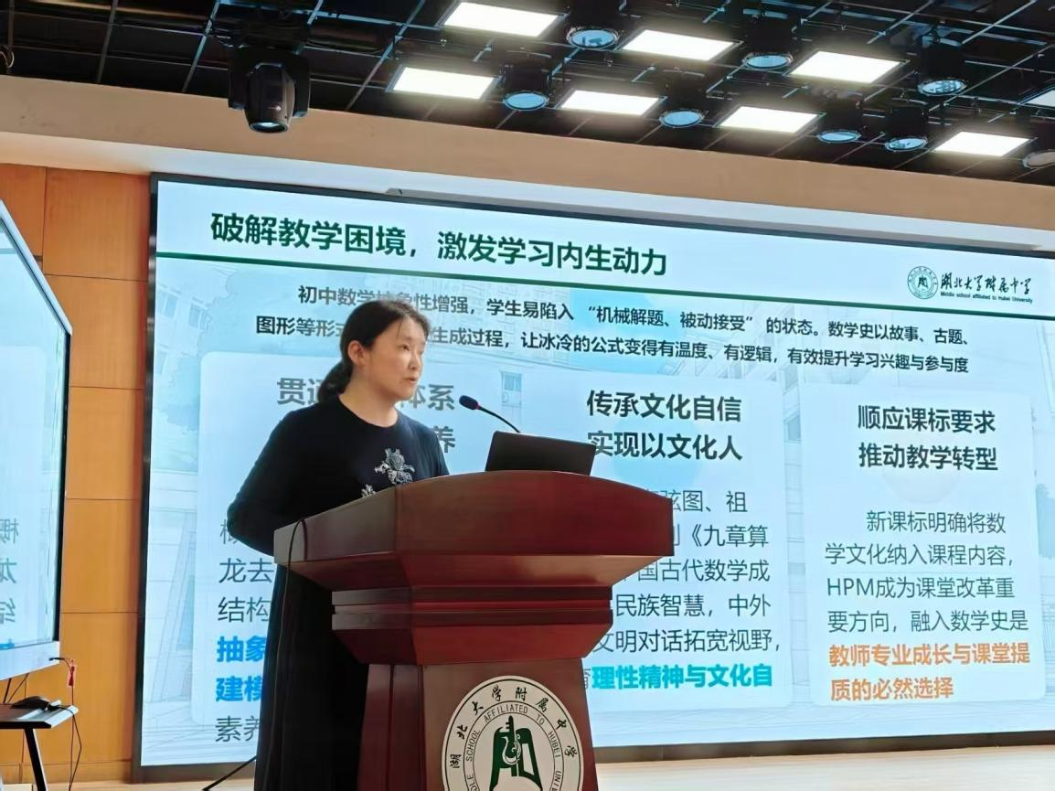 湖北大學(xué)附屬中學(xué)胡芬芬老師作《以文化人,以史啟智》專題報告,立足學(xué)校數(shù)學(xué)教研組實(shí)踐,構(gòu)建數(shù)學(xué)文化融入教學(xué)的立體化路徑,展示實(shí)踐探索成果,明確下一步工作思路,為全市初中數(shù)學(xué)教研組提供可借鑒的實(shí)踐樣本,推動數(shù)學(xué)課堂轉(zhuǎn)型。