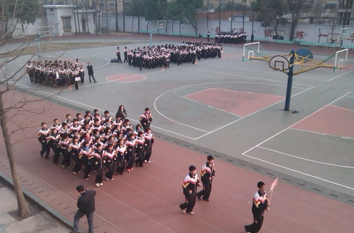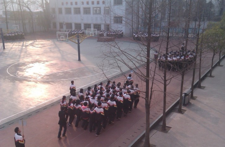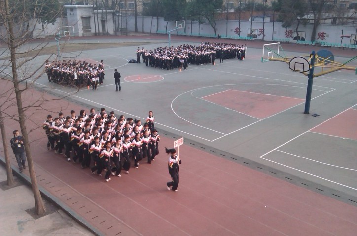 比賽成績采取現(xiàn)場比賽成績占總成績的80%,平時大課間跑操情況占總成績的20%的形式,從全校四個非畢業(yè)年級中共角逐出12個較優(yōu)勝的班級參加三月下旬的決賽。