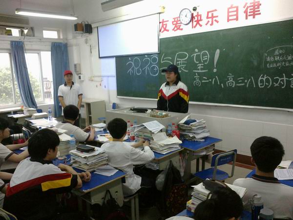 高二年級各班經(jīng)過精心的準(zhǔn)備,帶著給高三的學(xué)長們的祝福話語和鼓勵書信,在班會課來到了高三各班級。作為師弟師妹的高二年級代表首先走上講臺,用最溫情的話語和最誠摯的祝福向師兄師姐們表達(dá)自己的心意,期待著學(xué)長們能在五天后續(xù)寫附中的輝煌和各自人生的華彩。