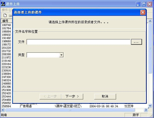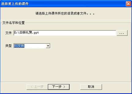 如果上傳的課件是一個(gè)單獨(dú)的文件,如PowerPoint文件(*.ppt),F(xiàn)lash(*.swf)文件等,選擇類型為“TS文件;”