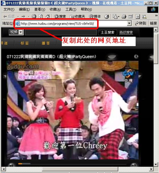 第二步:復(fù)制視頻所在網(wǎng)頁(yè)的網(wǎng)址,例如土豆網(wǎng)上的視頻“071222我猜我猜我猜猜猜C”,網(wǎng)址為“http://www.tudou.com/programs/view/3qygx6KRMuU/”,如下圖: