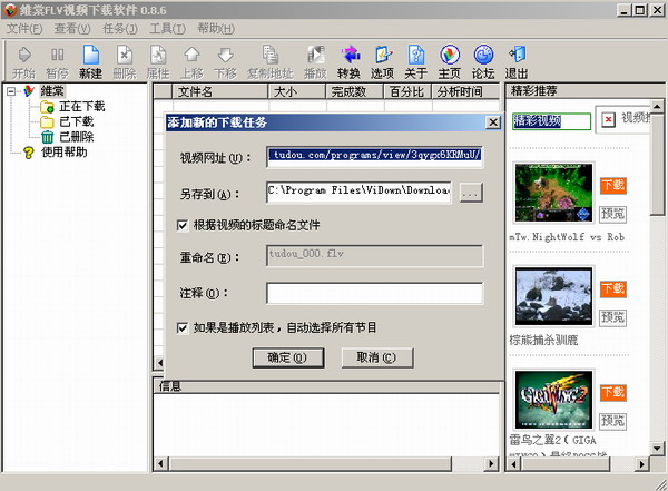 第三步:在維堂視頻下載軟件的界面,依次點(diǎn)擊“任務(wù)”——“新建下載任務(wù)”,此時(shí)彈出“添加新的下載任務(wù)”窗口,剛剛復(fù)制的網(wǎng)址已經(jīng)在“視頻網(wǎng)址”的文本框中,如下圖: